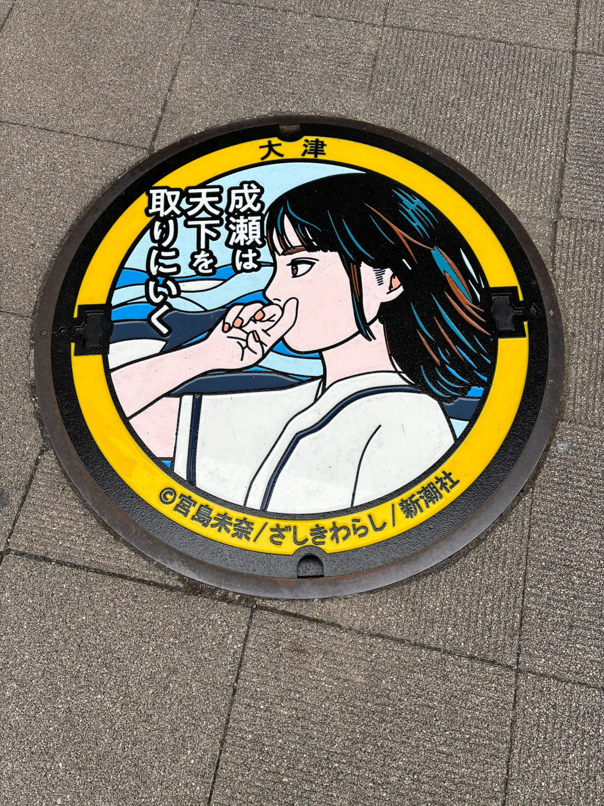 ご存じの通り、宮島未奈さんは「成瀬は天下を取りにいく」で2024年に本屋大賞を受賞されました。その主人公・成瀬あかりをデザインしたマンホールの蓋が京阪膳所駅の改札前に設置されました。